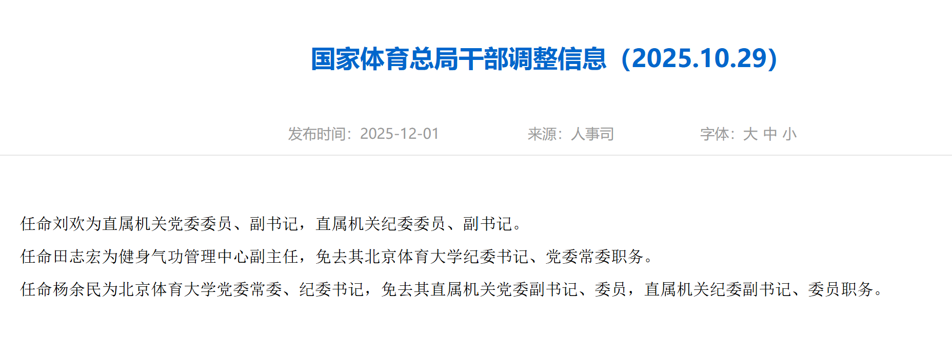 国家体育总局干部调整信息