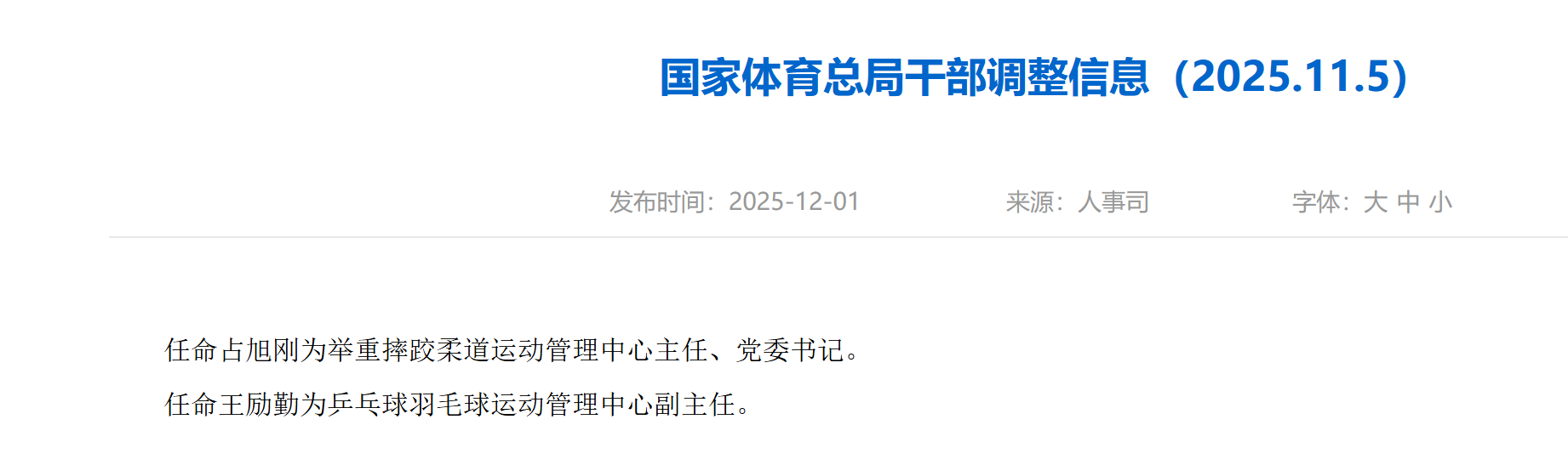 任命占旭刚为举重摔跤柔道运动管理中心主任、党委书记。