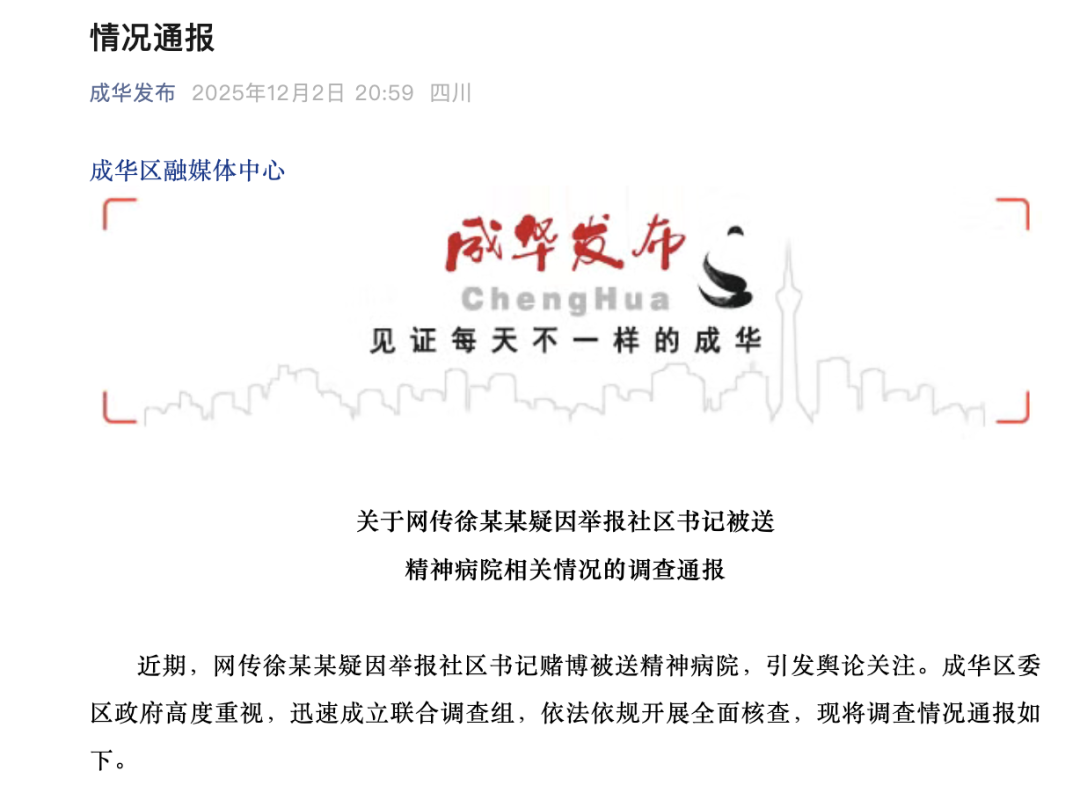 12月2日晚,四川成都成华区联合调查组发布“关于网传徐某某疑因举报社区书记被送精神病院相关情况的调查通报”。
