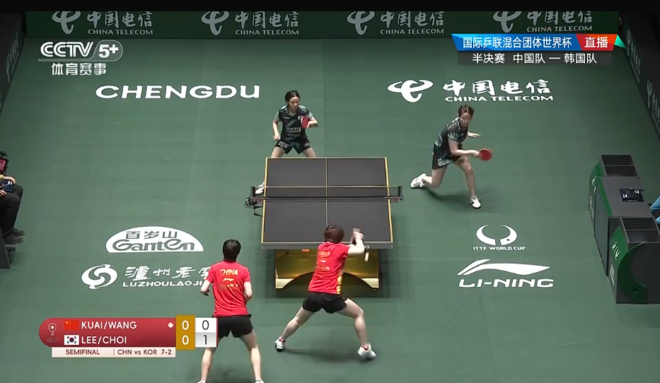 第四场女双比赛,蒯曼/王曼昱1-1战平李恩惠/崔孝珠,两局比分为:5-11、14-12。最终,中国队大比分8-3击败韩国队。