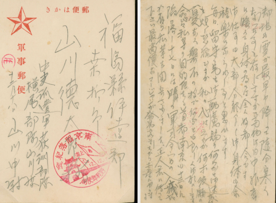 一件是侵华日军中尉山川仪仁于1937年12月18日寄往日本福岛县山川德太郎的战地信件。信封正面清晰盖有“南京陷落纪念”邮戳。