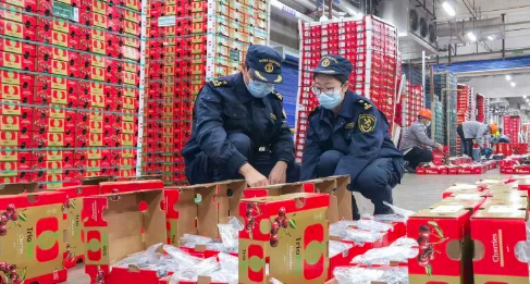 12月6日,南沙海关关员对进口车厘子进行监管。新华社发