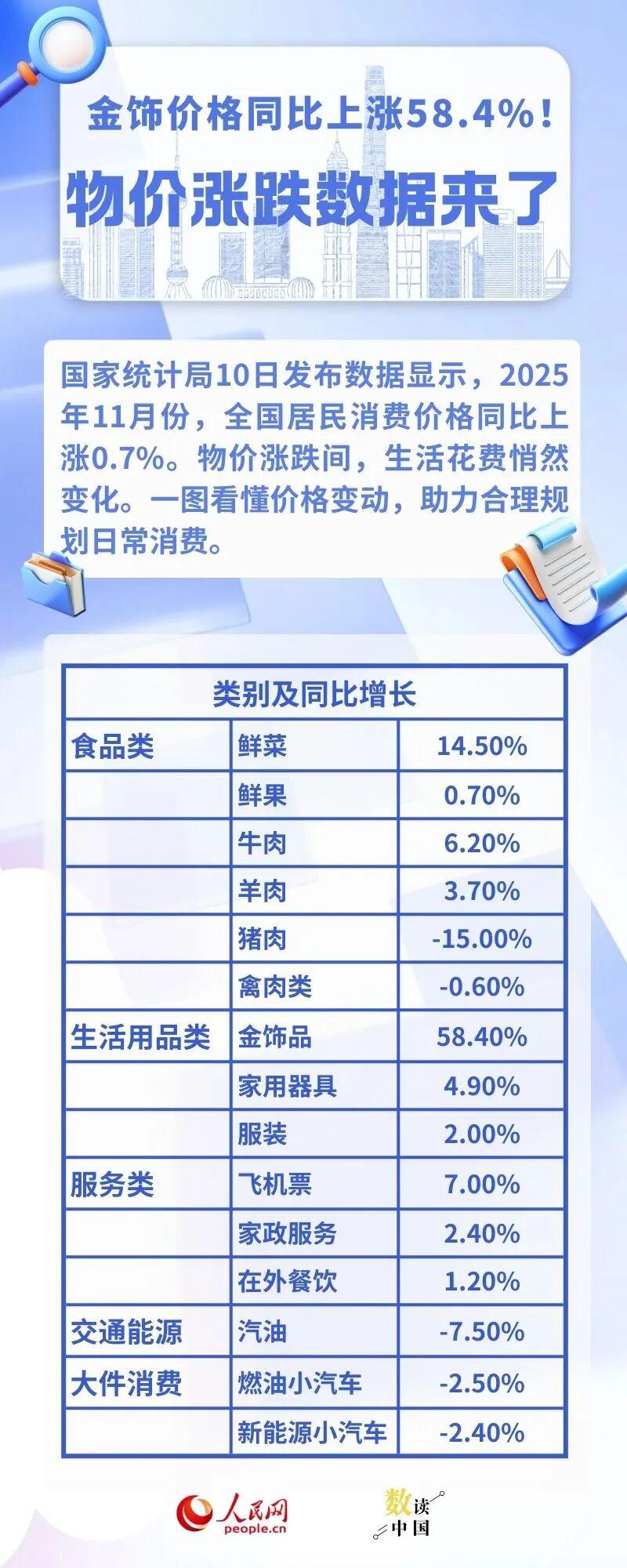 金饰价格同比上涨58.4%!物价涨跌最新数据来了
