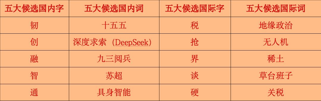 “汉语盘点2025”年度各组前五位字词中,“韧”“创”“税”“抢”“十五五”“苏超”“地缘政治”“稀土”等热门字词入围。