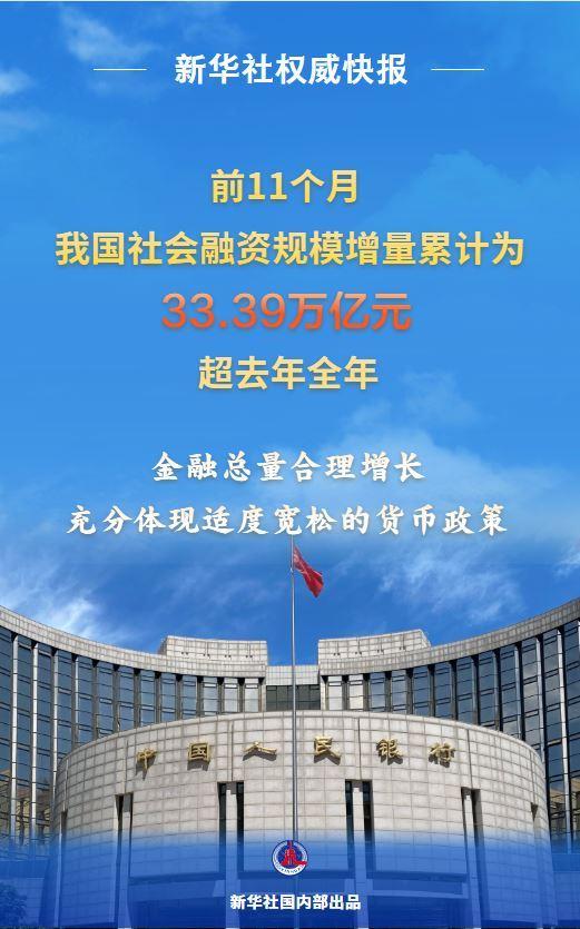 中国人民银行12月12日发布金融统计数据显示,前11个月,我国社会融资规模增量累计为33.39万亿元,超去年全年。11月末,广义货币(M2)余额336.99万亿元,同比增长8%;人民币贷款余额271万亿元,同比增长6.4%。金融总量合理增长,充分体现适度宽松的货币政策。