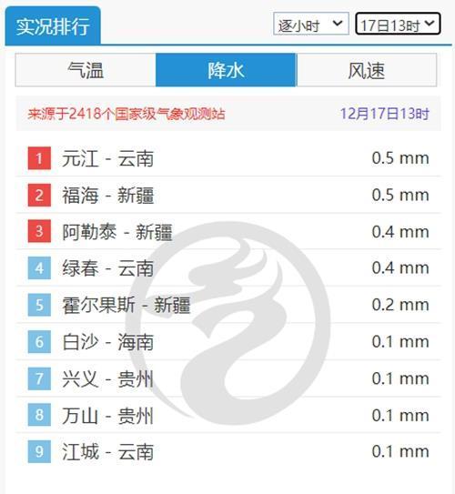 近日,我国大部地区雨雪持续稀少,17日13时,全国降水榜上凑不齐十个达到或超过0.1毫米降水的国家级气象站点。明后天(12月18日至19日)南北方雨雪将呈增多趋势,其中西北地区东部、内蒙古东部、东北地区将有大范围雨雪,局地大雪,南方以小雨为主,能起到一定润燥作用。