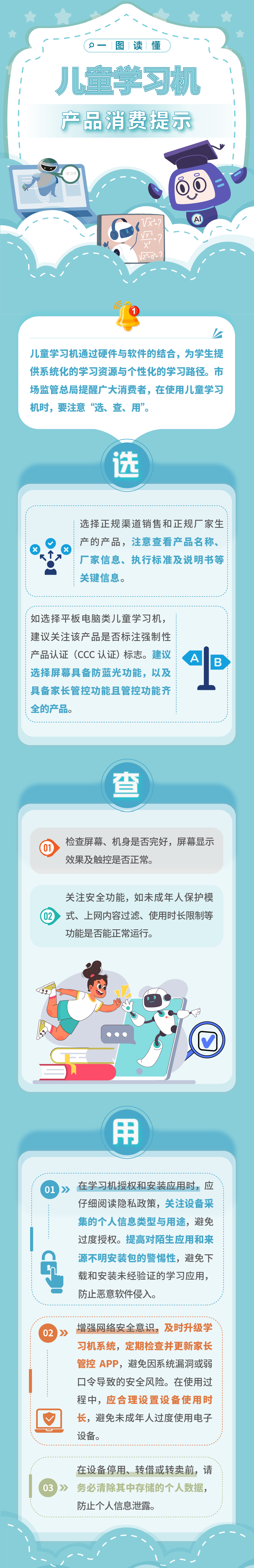 儿童学习机通过硬件与软件的结合,为学生提供系统化的学习资源与个性化的学习路径。市场监管总局提醒广大消费者,在使用儿童学习机时,要注意“选、查、用”。