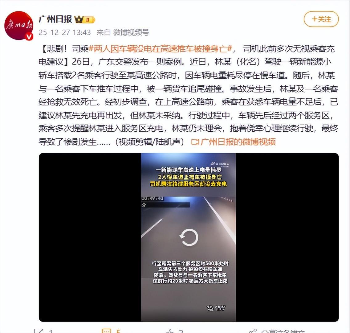 26日,广东交警发布一则案例。近日,林某(化名)驾驶一辆新能源小轿车搭载2名乘客行驶至某高速公路时,因车辆电量耗尽停在慢车道。随后,林某与一名乘客下车推车过程中,被一辆货车追尾碰撞。事故发生后,林某及一名乘客经抢救无效死亡。