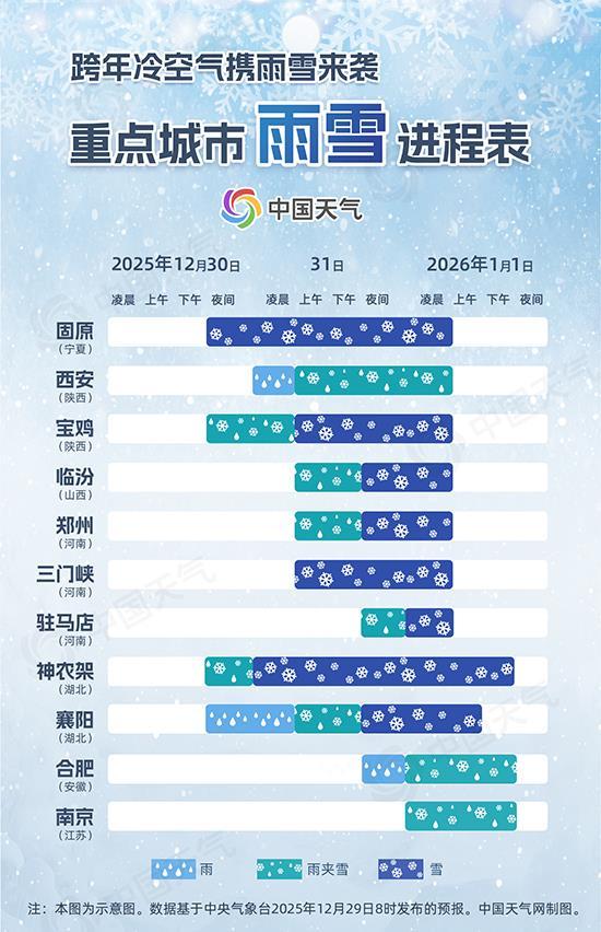 明天夜间开始,西北地区东部等地将率先迎来降水天气,例如甘肃东部、宁夏中南部、陕西中南部、山西西南部、河南西部、湖北西部等地可能出现降雪或雨雪混杂。宁夏固原等地明天夜间就将出现降雪;陕西西安、宝鸡等地则可能以降雨或雨夹雪开场,后天上午起逐渐转为雨夹雪或纯雪,降水过程将持续至元旦凌晨。值得一提的是,作为今冬北方唯一尚未飘雪的大城市,西安有望在这场过程中迎来初雪。