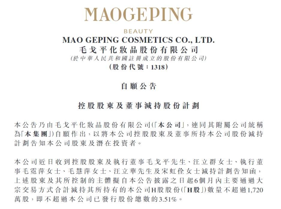 据悉,这是毛戈平公司港股上市一年多以来,第一次发布控股股东减持公司股份计划;此次减持股份的6位执行董事中,有5位为毛戈平家族成员。