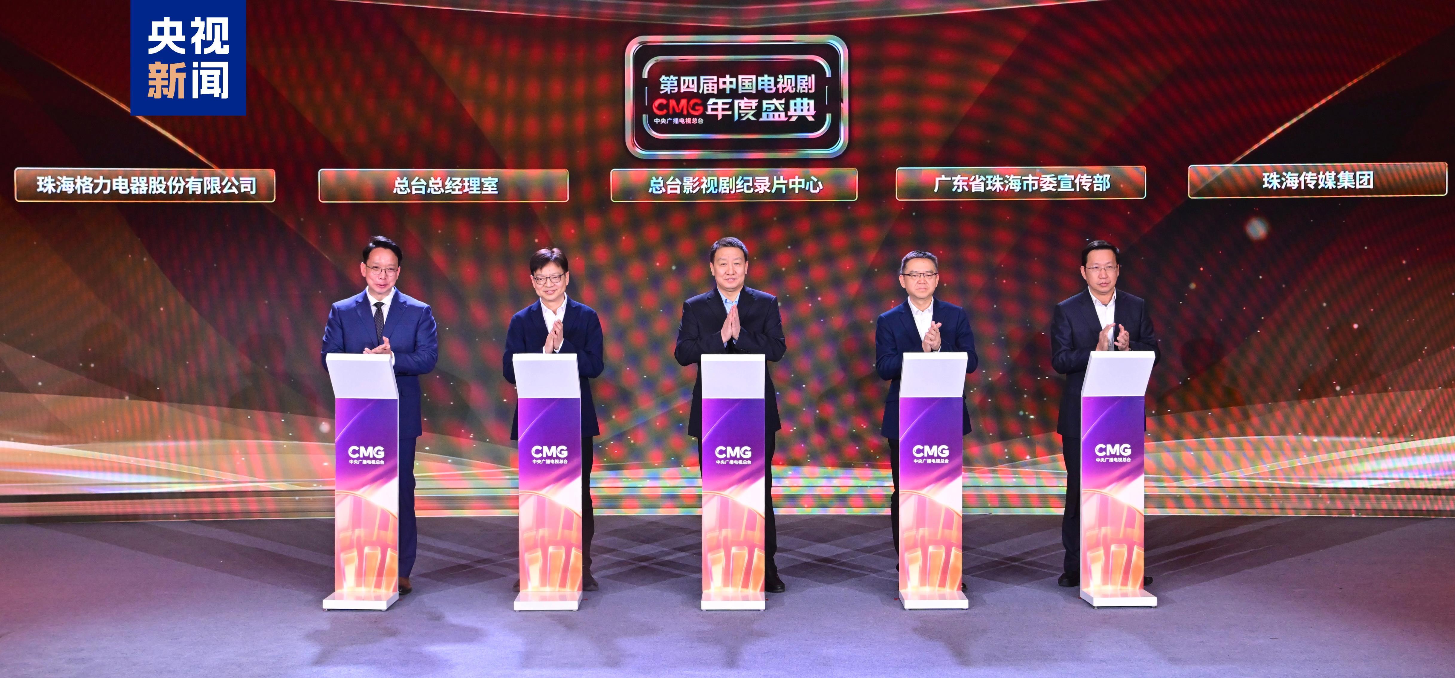 △中央广播电视总台影视剧纪录片中心副召集人夏晓辉,广东省珠海市委常委、宣传部部长徐剑,总台总经理室副召集人徐立军,珠海传媒集团董事长孙锡炯,珠海格力电器股份有限公司副总裁朱磊共同发布CMG中国电视剧年度盛典战略合作