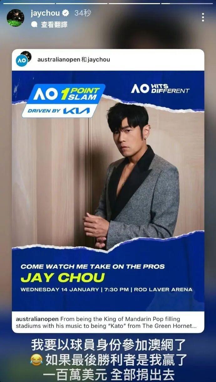 另据报道,周杰伦发文称自己将以球员身份参加澳网“一球制胜”挑战赛,他调侃自己可能连球都碰不到就会出局,并称只有一球,所以大家不用特地赶过来,自己如果赢了将会捐赠奖金。