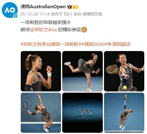 此前据体坛报报道,北京时间2025年12月24日,澳网官方更新了参加年初“一球制胜大满贯”赛事的球员名单,郑钦文确认参加。