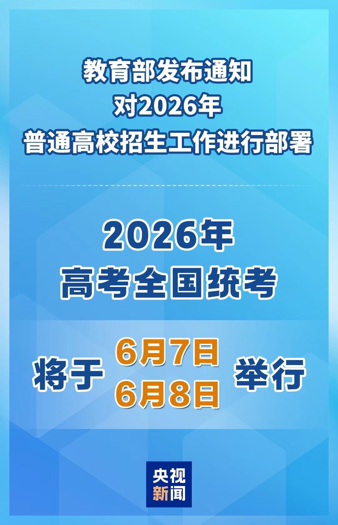 教育部今天(22日)发布通知,对2026年普通高校招生工作进行部署,2026年高考全国统考将于6月7日、8日举行。