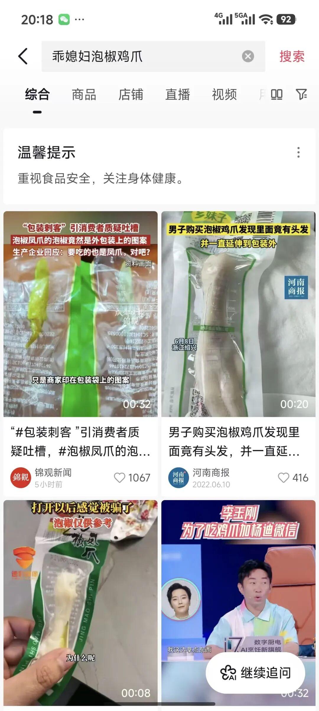 央视“3·15”晚会曝光漂白鸡爪:食品加工车间刺鼻的腥臭味让人作呕,生产环境脏乱不堪,有毒的双氧水随便用。当晚,新黄河记者在淘宝、京东、拼多多、抖音电商检索“乖媳妇泡椒鸡爪”后发现均已显示无相关商品或暂无搜索结果,抖音电商平台显示,“重视食品安全。关注身体健康。”