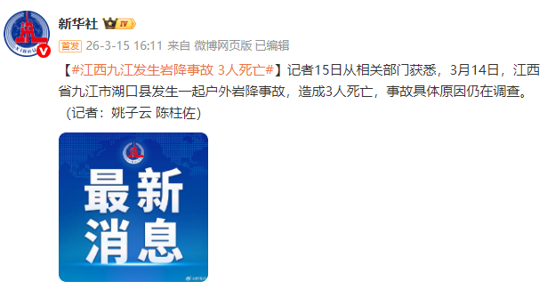 记者15日从相关部门获悉,3月14日,江西省九江市湖口县发生一起户外岩降事故,造成3人死亡,事故具体原因仍在调查。