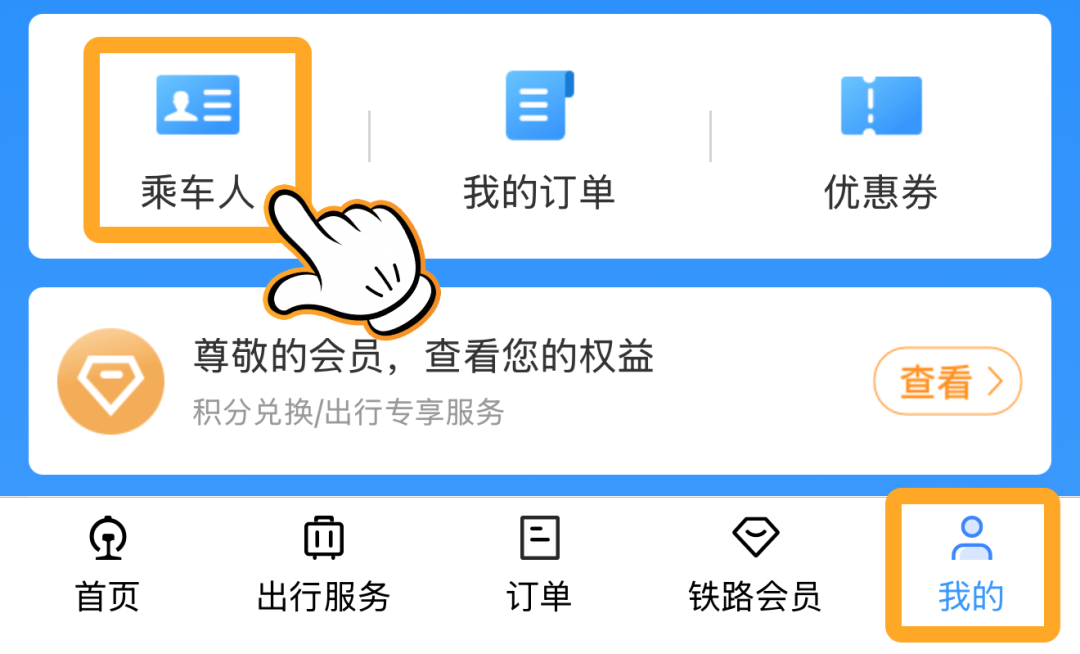 打开铁路12306App,点击【我的】-【乘车人】,添加儿童乘车人信息。