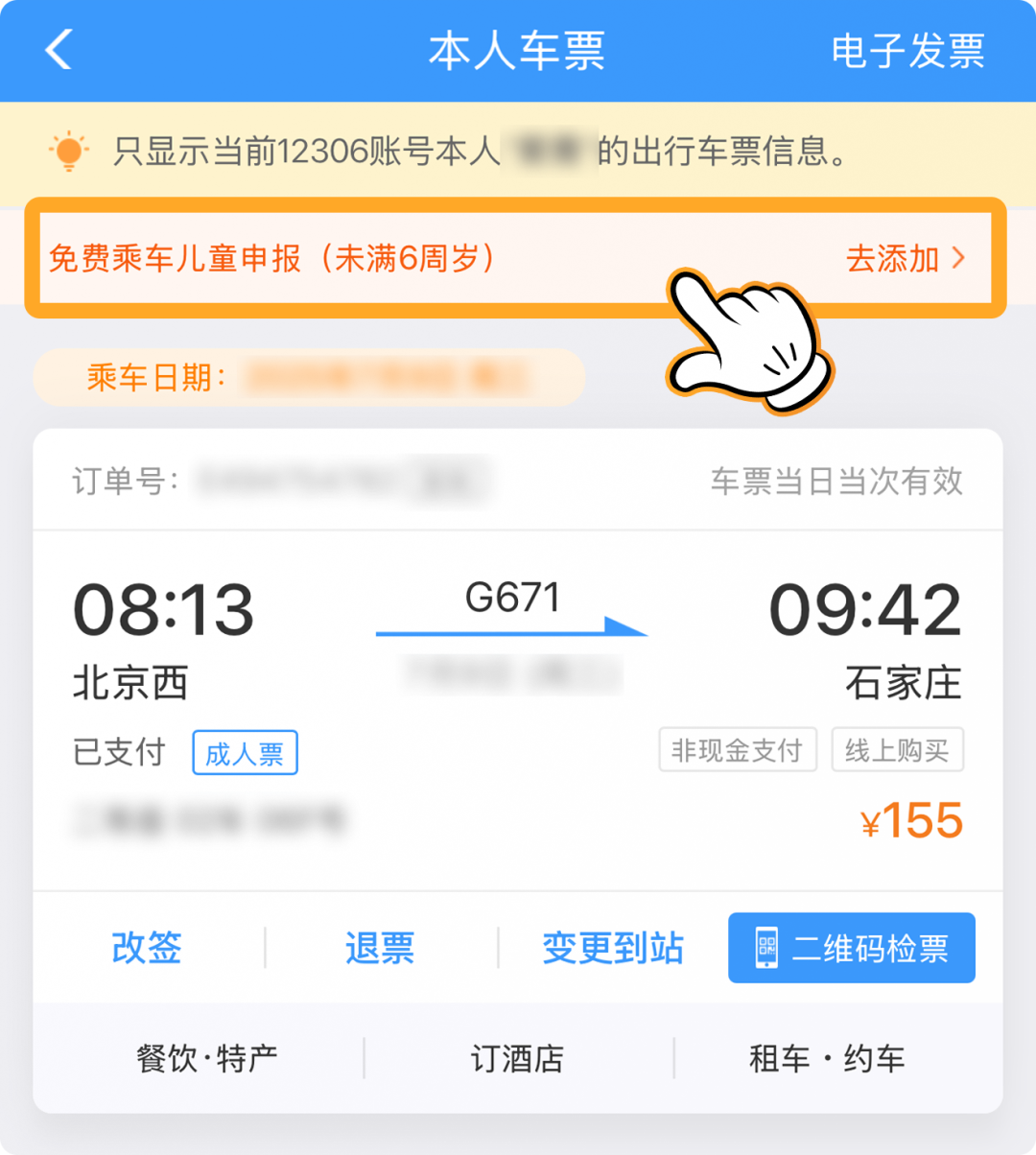 退票:免费儿童申报添加完成后,如所关联的成人票进行退票后,免费乘车儿童将被一并取消。
