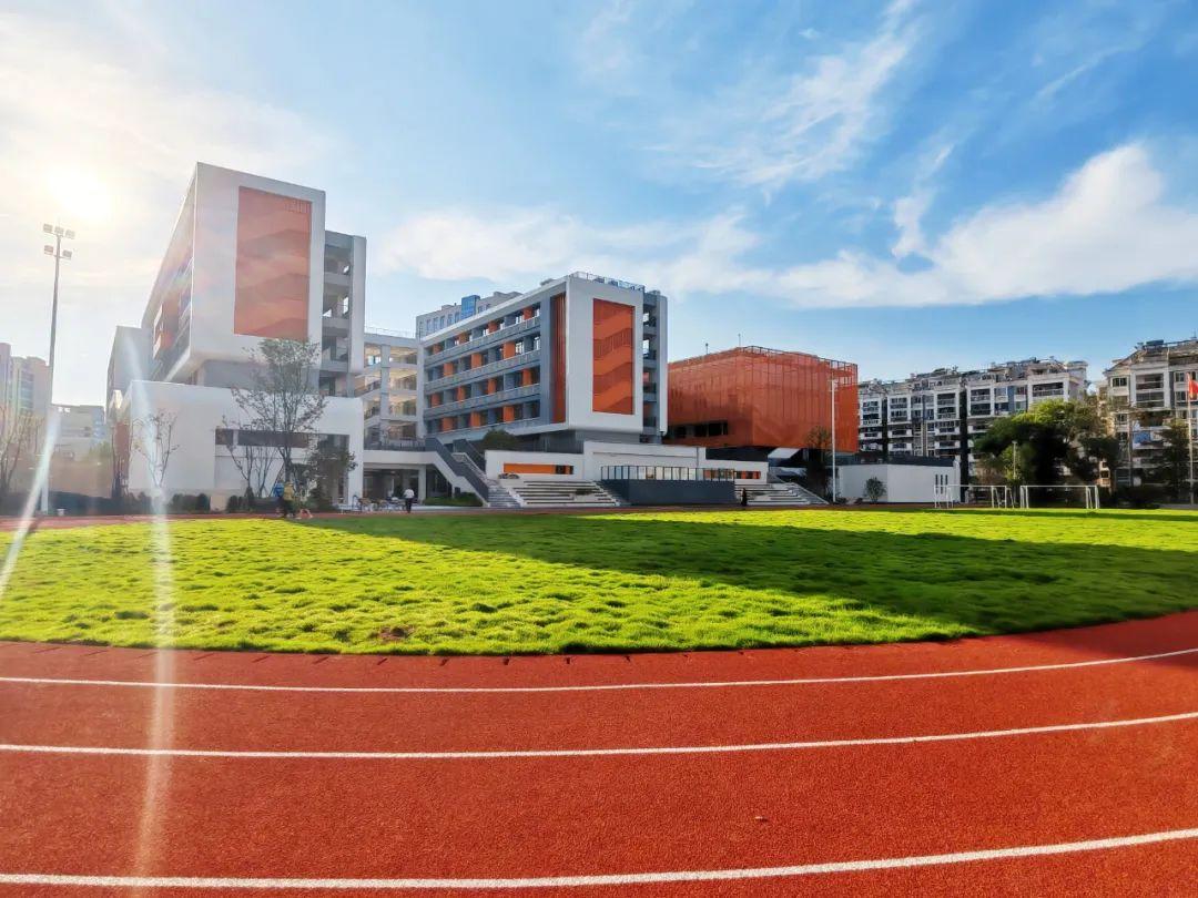 走进新校区可以看到橙白灰相间的建筑群错落有致,简洁大气的外立面,在阳光下格外醒目。