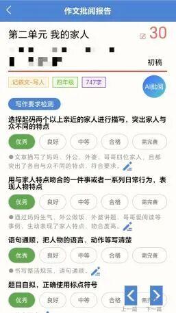 在四年级第二单元“我的家人”主题作文写作中,小吴按照老师提出的要求,通过“鼓教通”App上传作文,随后AI批改系统逐条分级打分,在4项要求中都给出了“优秀”的评判,最终给出了30分的满分。