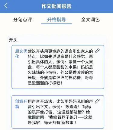“报告非常详细,看得我头皮发麻。”小吴同学的妈妈告诉记者,AI提出的修改建议十分细致,其中“升格指导”的内容更是让她大赞,她想让孩子根据这上面的意见来修改。