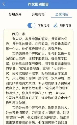 据介绍,修改作文过程中,AI会用红线圈出错字,还会作出“分句点评”“升格指导”“全文润色”。