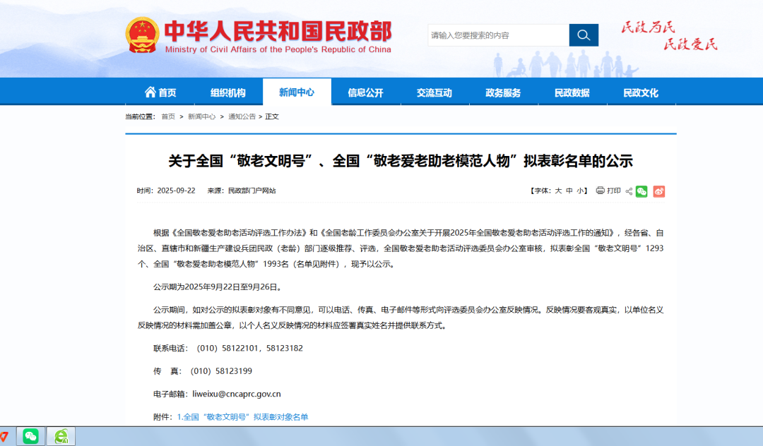 日前,经各省、自治区、直辖市和新疆生产建设兵团民政(老龄)部门逐级推荐、评选,全国敬老爱老助老活动评选委员会发布拟表彰全国“敬老文明号”、全国“敬老爱老助老模范人物”公示。