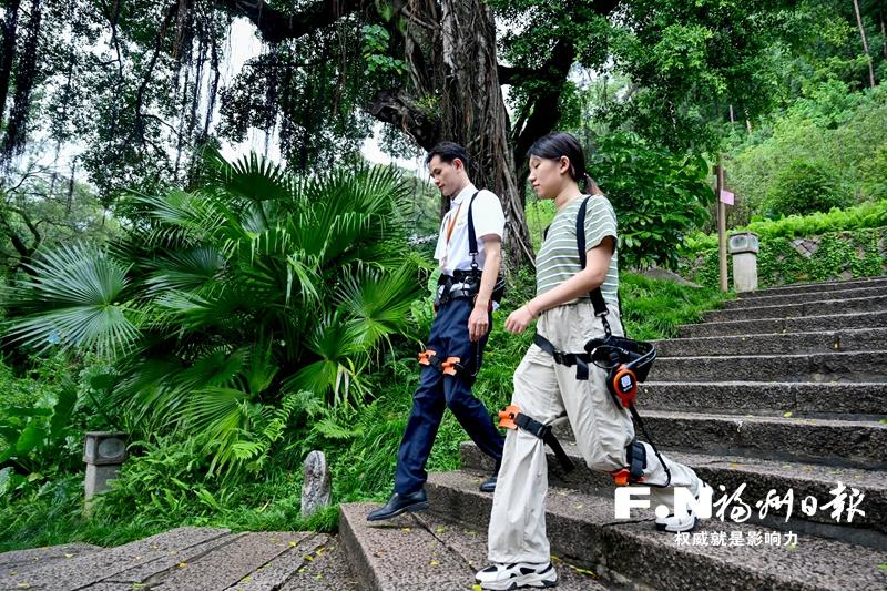 鼓山绿意盎然,环境优美,吸引不少市民游客前来登山打卡。但长时间的登山,对膝盖和关节是不小的负担,下山路更是容易损伤膝盖。“受今年流行的‘爬山神器’启发,我们引进了外骨骼机器人,不管是上坡时的动力支持,还是跨步、下坡时的关节保护,它都能显著减轻膝盖和腿部压力。希望能帮助体力一般的游客、膝盖不适的中老年人以及追求效率的徒步爱好者,能无负担地畅游景区。”上述工作人员说。