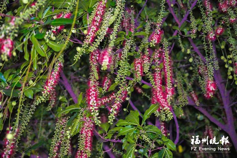 连日来,晋安区鹤林生态公园迎来一道美丽风景线——红花玉蕊盛放,引得不少市民驻足观赏。