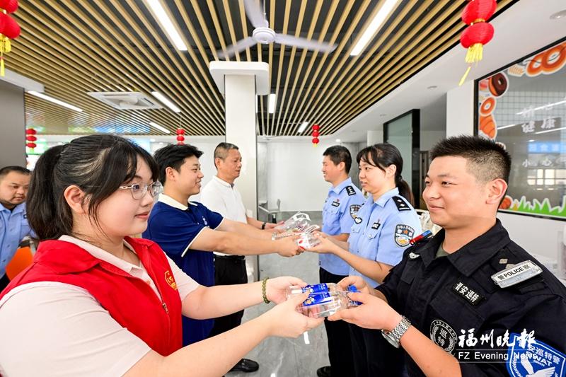 上午9时多,爱心物资送达晋安公安分局大院,爱心企业工作人员一边将瓶装水、茉莉花茶礼包等物资递到民警手中,一边叮嘱大家在执行任务时注意防暑、保重身体。“这份物资不仅解渴,更暖到了我们心里。”一名连续6年收到爱心物资的民警说。