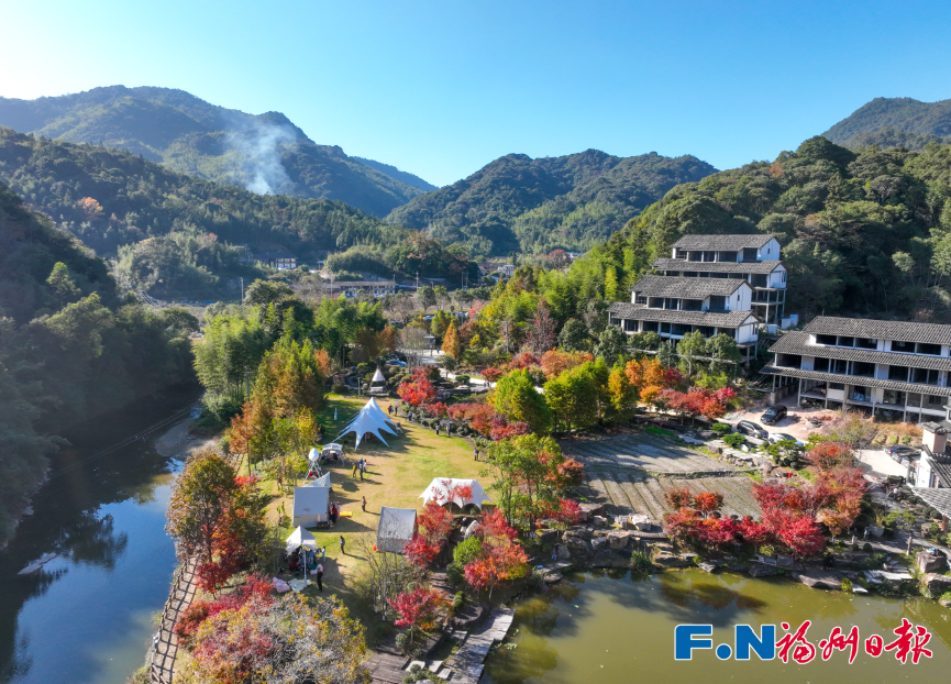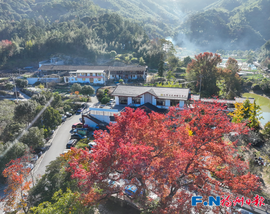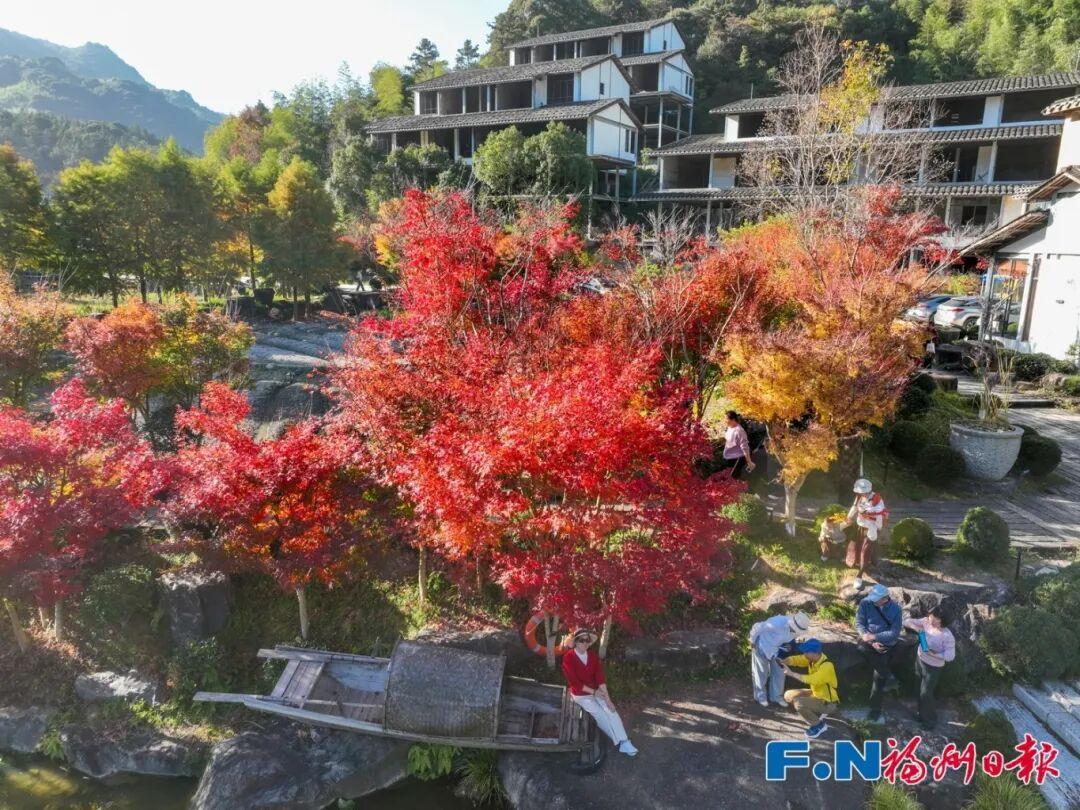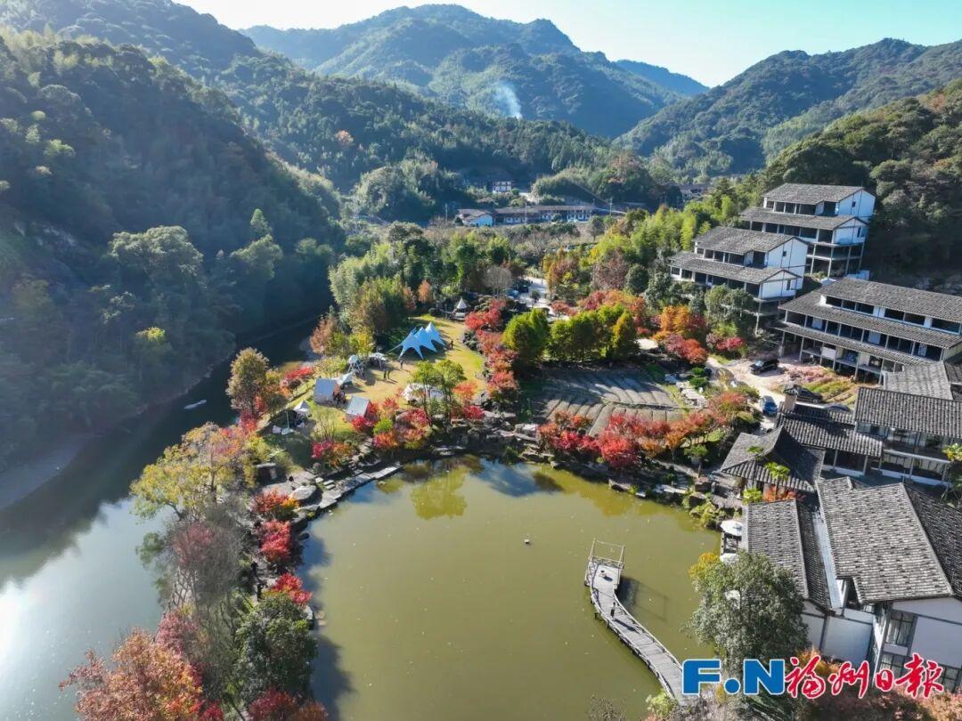 在村口南阳溪下游,两岸枫叶如霞,水杉翠绿,与溪中倒影交织成一幅多彩画卷。