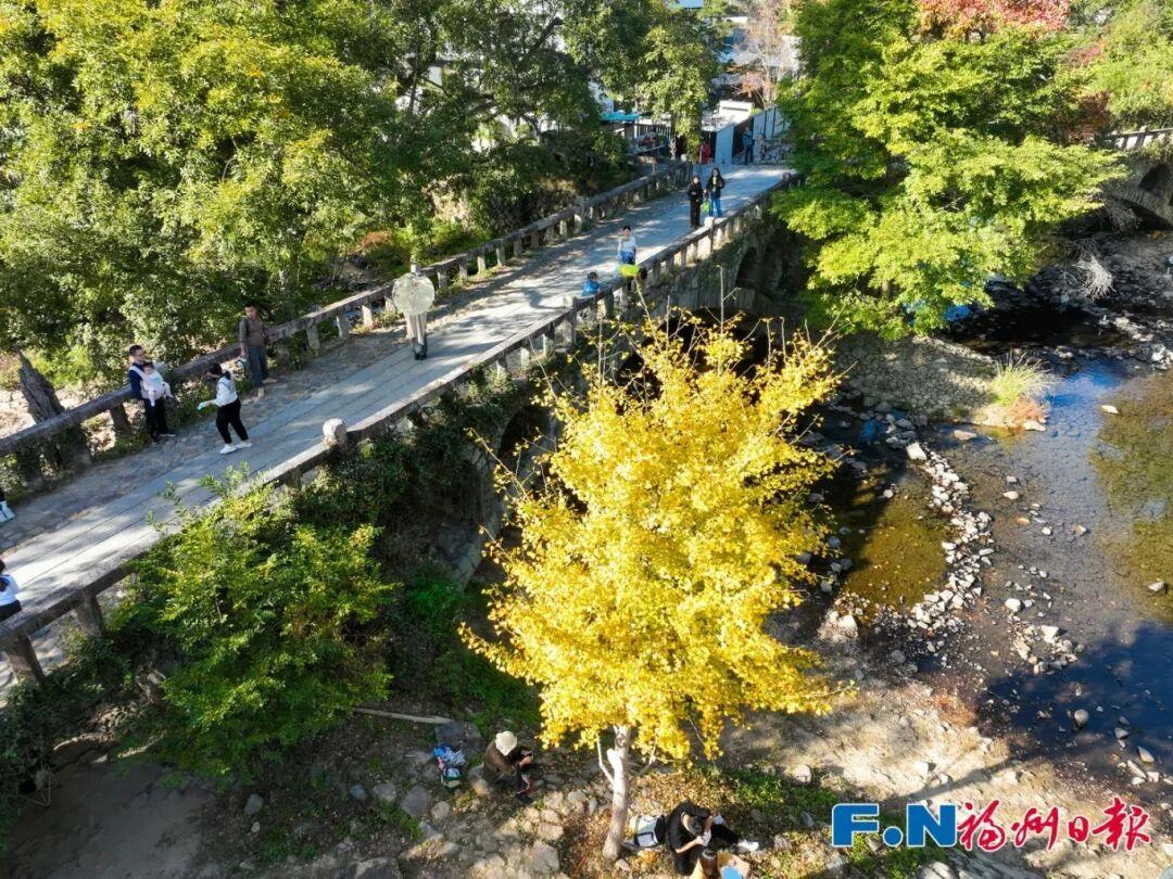 此外,在村中古桥旁,双溪汇流处,火红的枫叶与金黄的银杏倒映水中,色彩层次丰富,充满了诗情画意。