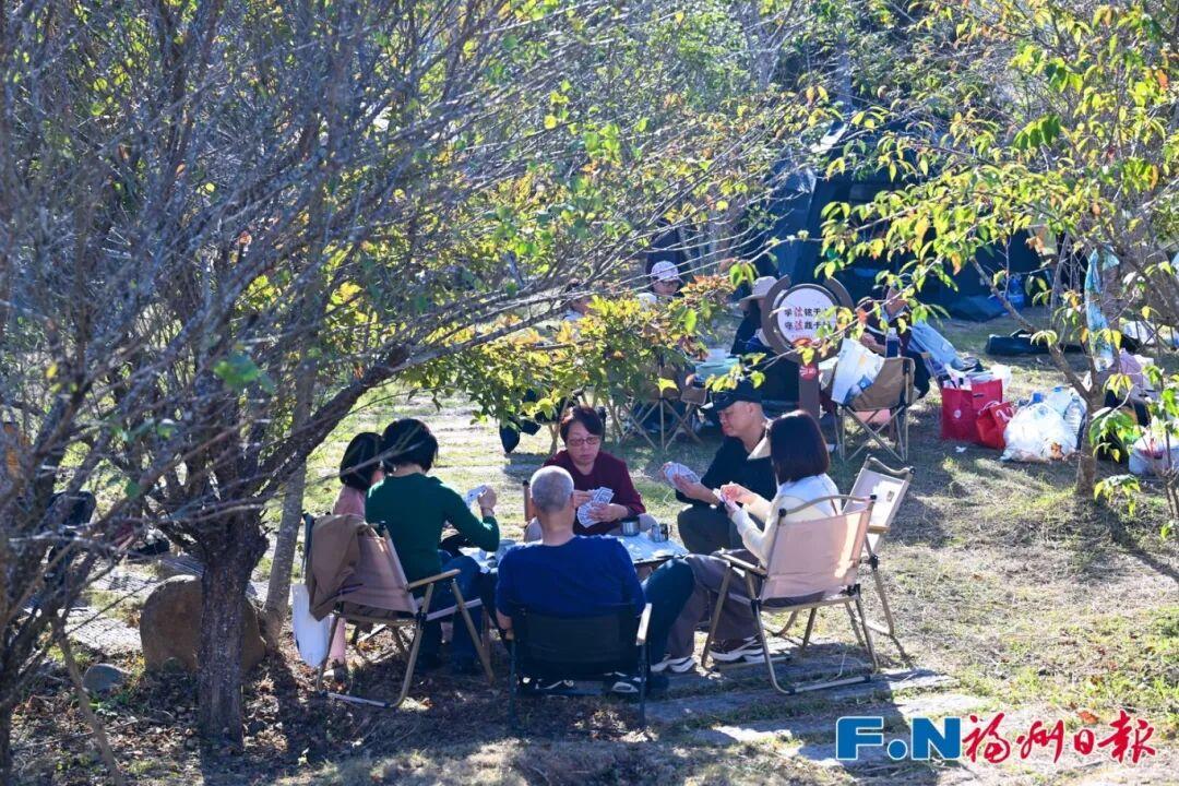 树下草地上,游客们搭起帐篷,围炉煮茶,享受品茗、晒太阳、拍照的惬意时光。