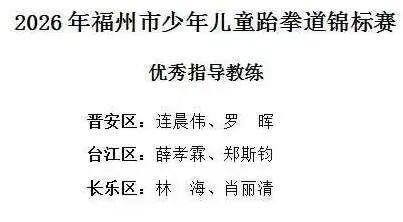 此外,本次比赛还评选出了优秀指导教练,他们分别是:晋安区的连晨伟、罗晖,台江区的薛孝霖、郑斯钧,长乐区的林海、肖丽清,他们为培养优秀跆拳道运动员付出了心血和努力。