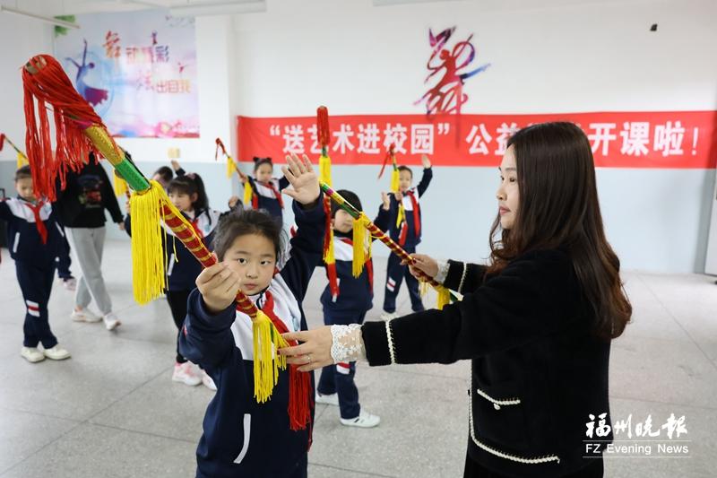 在连江东岱中心小学,学生练习钱箭舞(资料图)。连江县融媒体中心供图