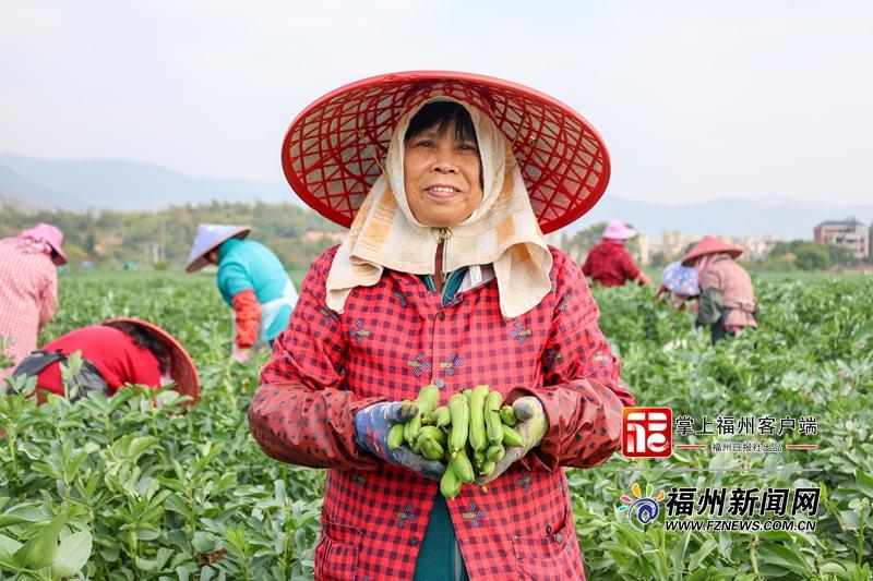 在连江县官坂镇辋川村,千亩蚕豆绿意绵延、长势喜人,饱满圆润的豆荚缀满枝蔓,在春风中轻轻摇曳,尽显勃勃生机。田间地头,50余名采摘工人穿梭于豆株之间,指尖翻飞、动作娴熟,麻利地采摘鲜嫩的豆荚,不多时,一个个筐篓便被装满。采摘完成后,工人们迅速进行分拣、打包、装车,全程高效衔接,力争将最新鲜的蚕豆第一时间运往各地市场。