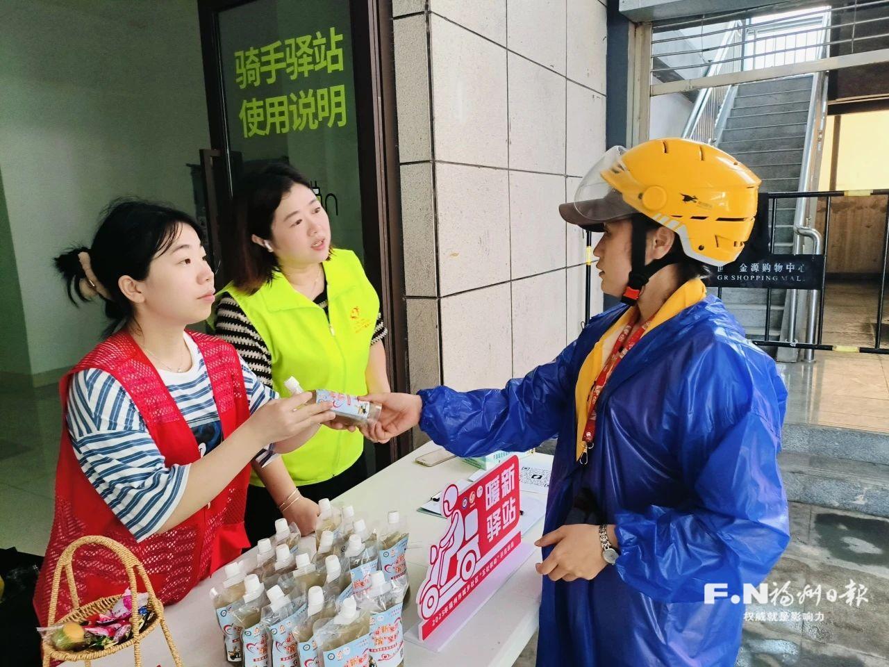 社工为外卖小哥送上解暑凉茶。(受访者供图)
