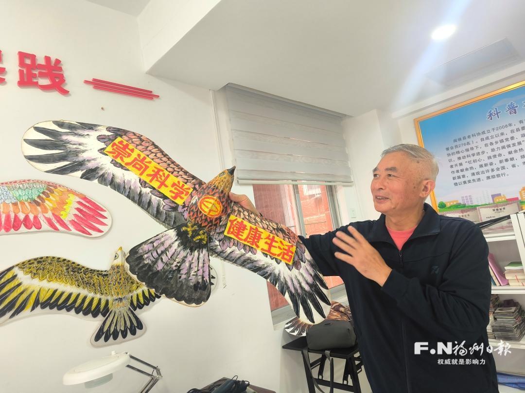 黄永国在展示盘鹰风筝。通讯员 林若野 摄