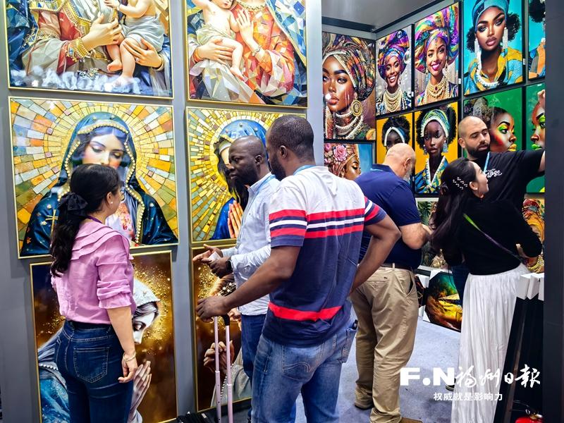在同一个展馆的不远处,闽侯县兴诚工艺品有限公司的展位同样人流如织。作为广交会的“老面孔”,该公司此次带来近20个品类、500多款新产品。“我们重点推出喷绘画和手工结合的新系列装饰画,既保留传统工艺的温度,又注入现代美学理念,特别受中东和东南亚客户的欢迎。”该公司相关负责人说。