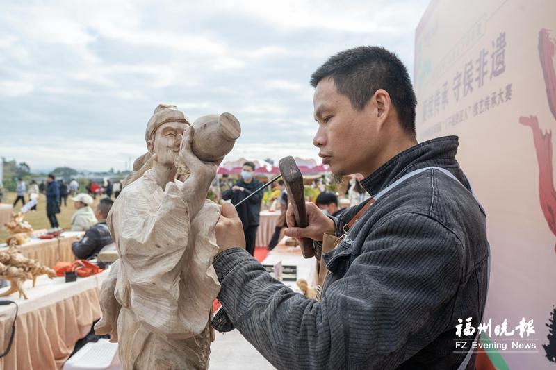 非遗匠人现场制作木雕。