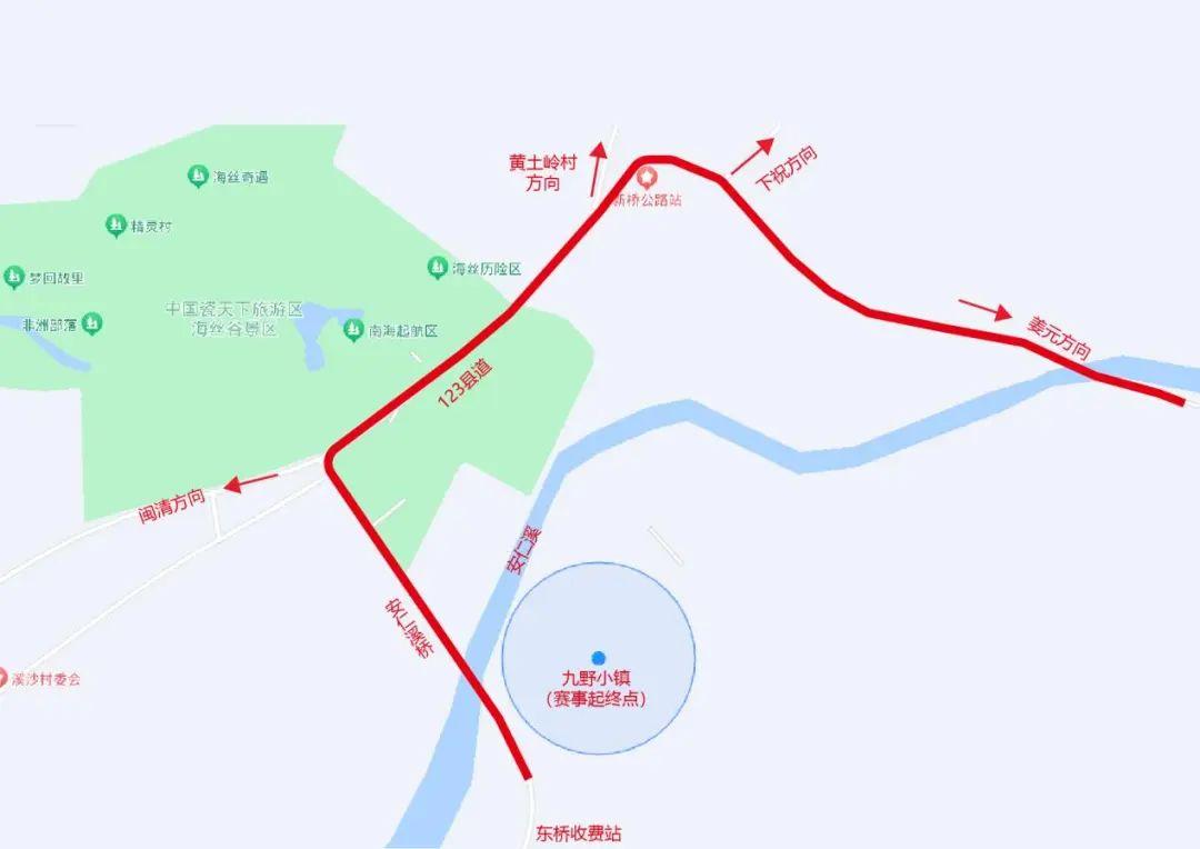 2025年4月20日7:55至8:20,九野小镇—游客集散中心—新桥公路站—姜元方向路段双向禁止机动车通行。
