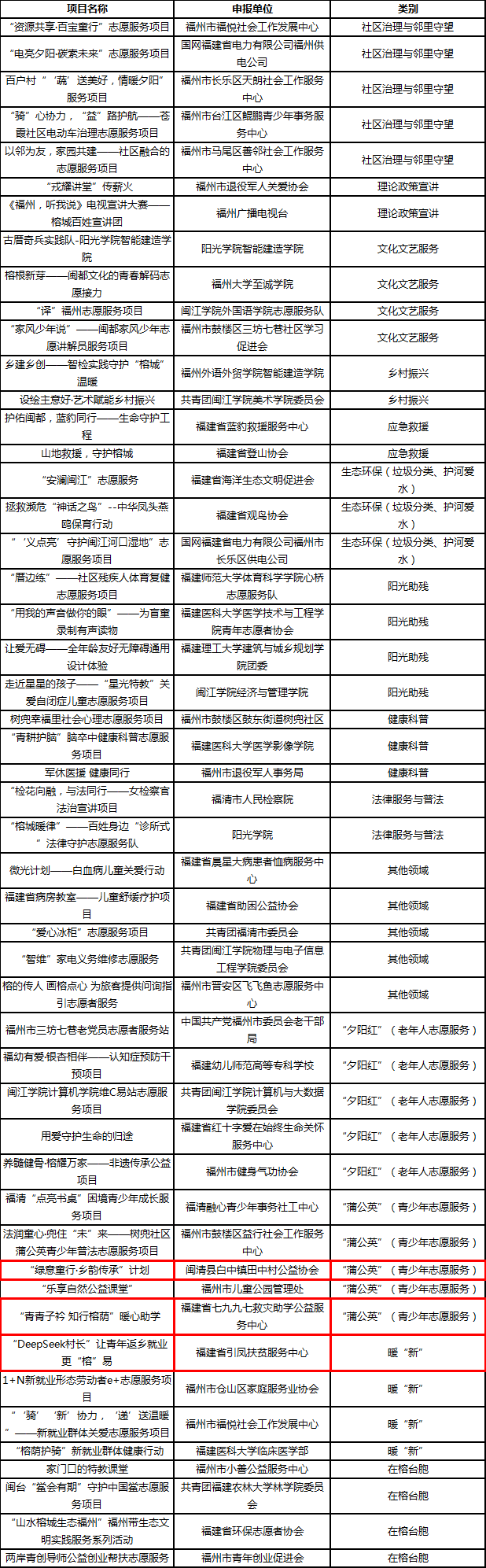 其中,白中田中村公益协会“绿意童行·乡韵传承”计划、7997救灾助学公益服务中心“青青子衿·知行榕荫”暖心助学、福建省引凤扶贫服务中心“DeepSeek村长”让青年返乡就业更“榕”易等3个项目入围复赛。