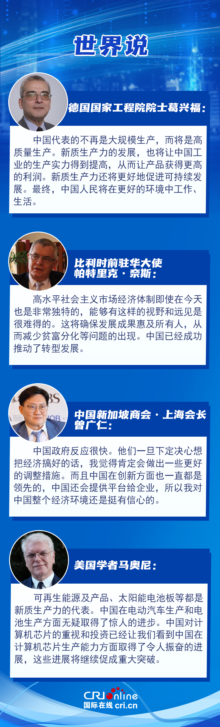 多位国际人士对中国经济发展充满信心,高度肯定中国政府在经济发展中的核心引领作用,并对中国在高质量生产及高精尖领域的创新领先地位表示赞赏。