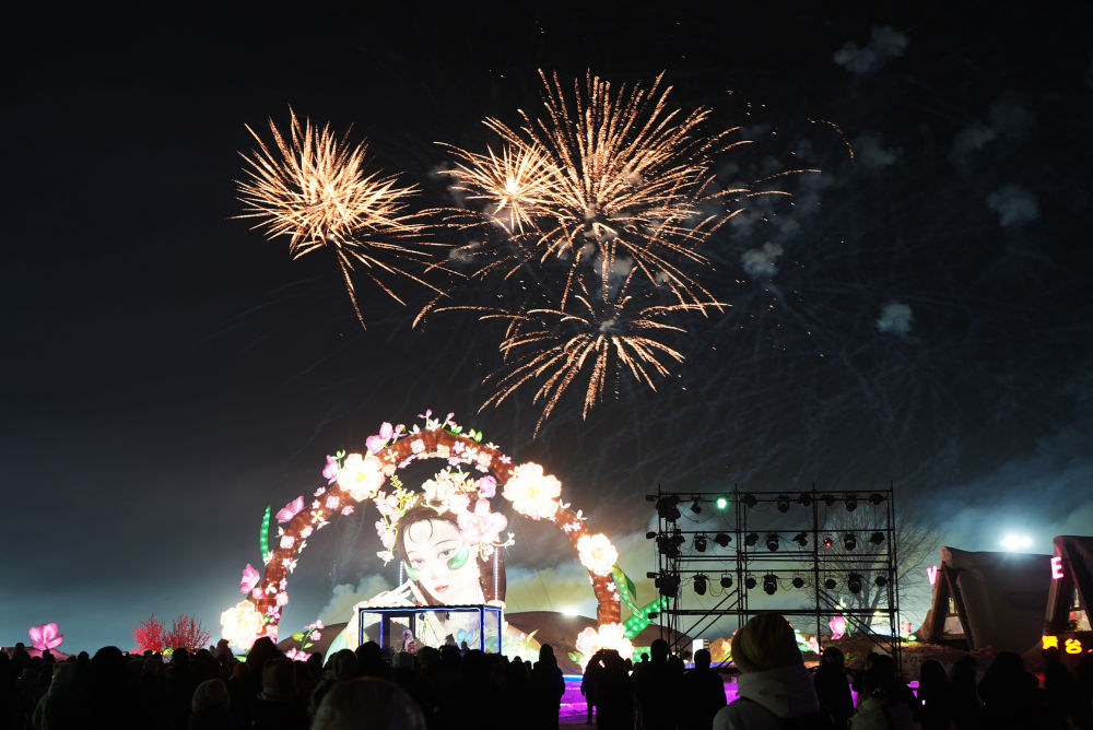 2025年1月12日,游客们在沈阳沈北新区稻梦小镇观看焰火表演。
