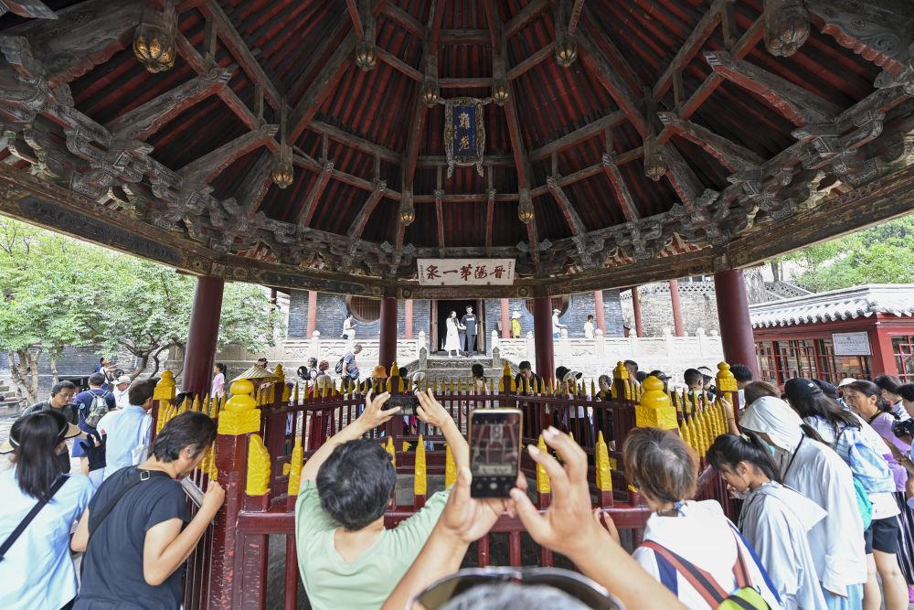 位于太原的晋祠,是祭祀西周初晋国首任诸侯唐叔虞的祠堂,是集中国古代祠祀建筑、园林、雕塑、壁画、碑刻艺术于一体的珍贵的千年古祠,是首批全国重点文物保护单位之一。这是2024年7月25日,游客在晋祠博物馆参观。