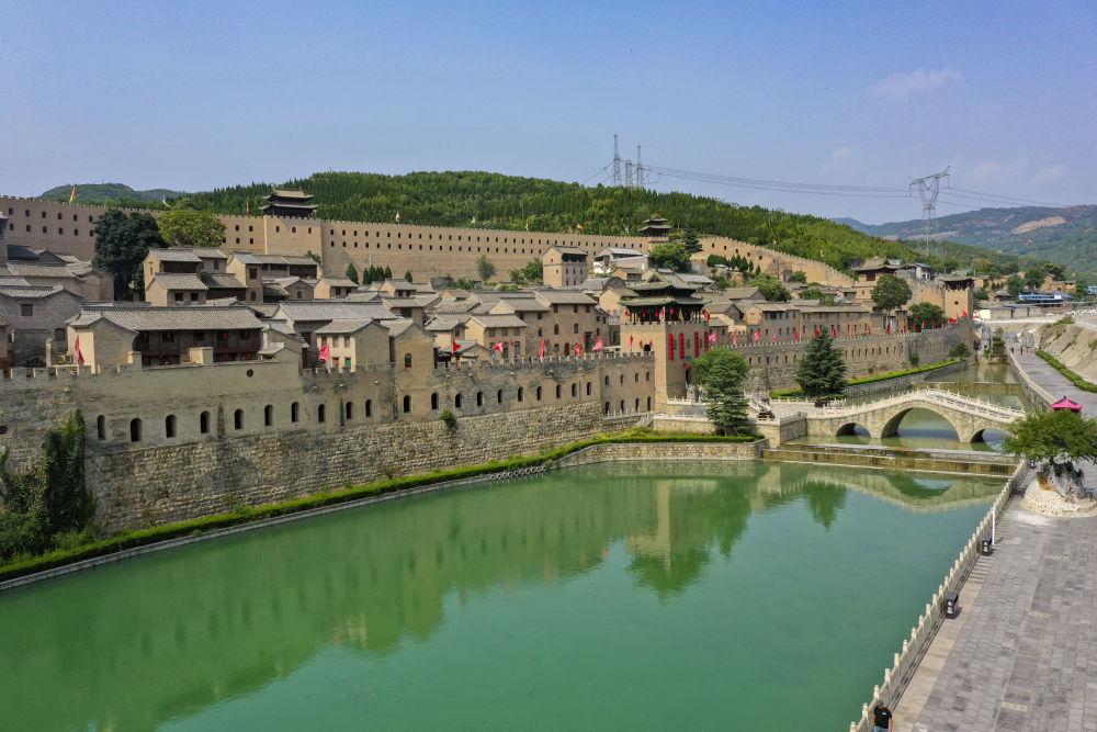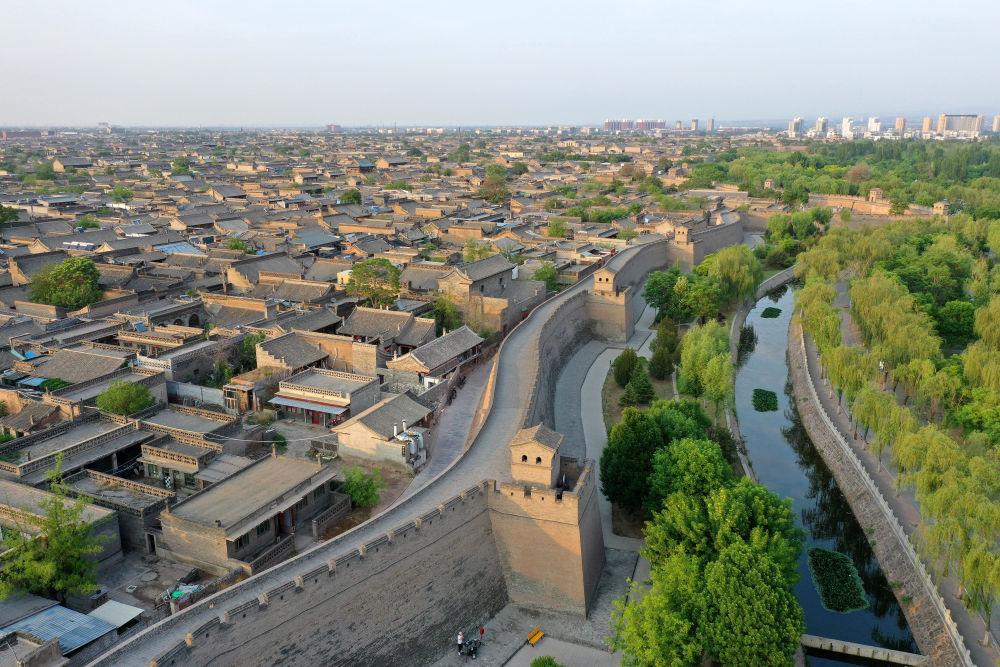 山西平遥古城城墙和护城河一角(2024年5月9日摄,无人机照片)。近年来,当地政府通过加固城墙、维护历史建筑、逐步建立古城违建整治长效机制等措施,使这座“活着的古城”散发新的生机。
