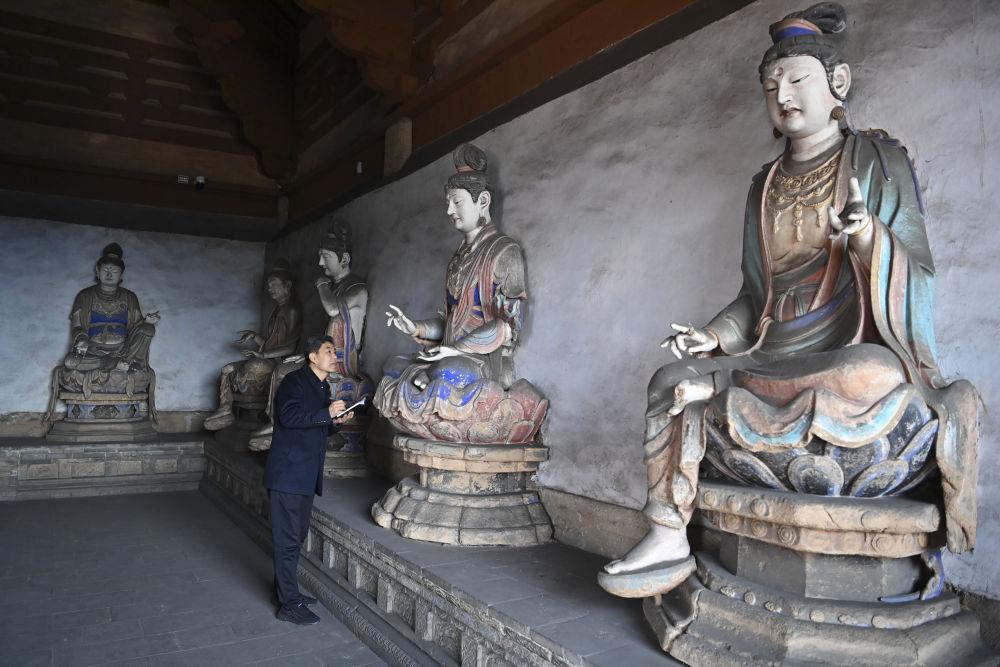 2024年3月16日,在山西长子县法兴寺圆觉殿,天王寺法兴寺崇庆寺文物所副所长张宇飞记录宋代彩塑的保存状况。张宇飞从1993年开始担任法兴寺文保员,在日常讲解之余,他通过查阅史料、研读碑文、请教专家、走访乡民等方式,挖掘文物背后的故事,通过自媒体发表介绍山西文化遗产的原创文章百余篇。