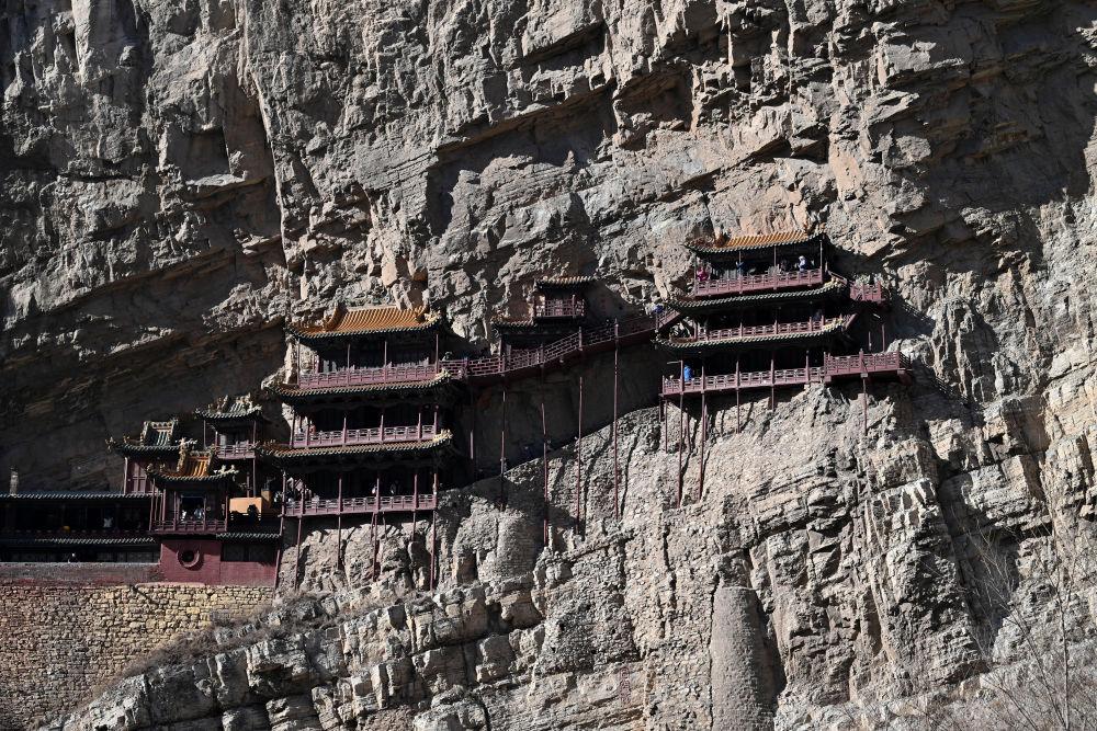 山西大同悬空寺位于恒山脚下,始建于北魏后期,迄今已有1500多年的历史(2025年2月28日摄)。