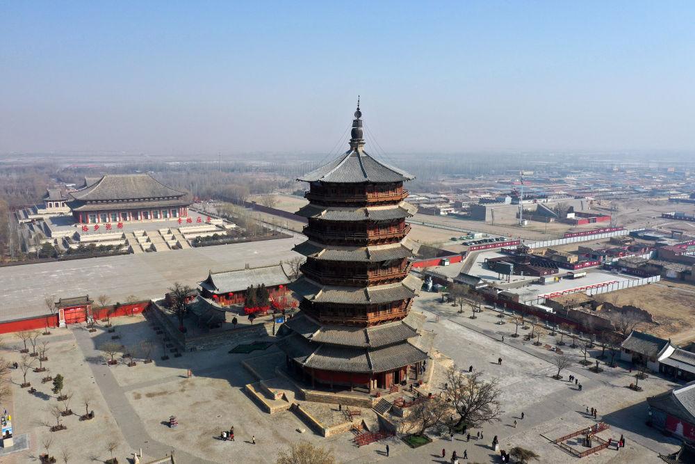 位于山西朔州市的应县木塔建于辽代清宁二年(1056年),塔高67.31米,上下连接的全部架构均由卯榫咬合而成,是世界上现存最古老、最高大的纯木结构建筑(2025年3月7日摄,无人机照片)。