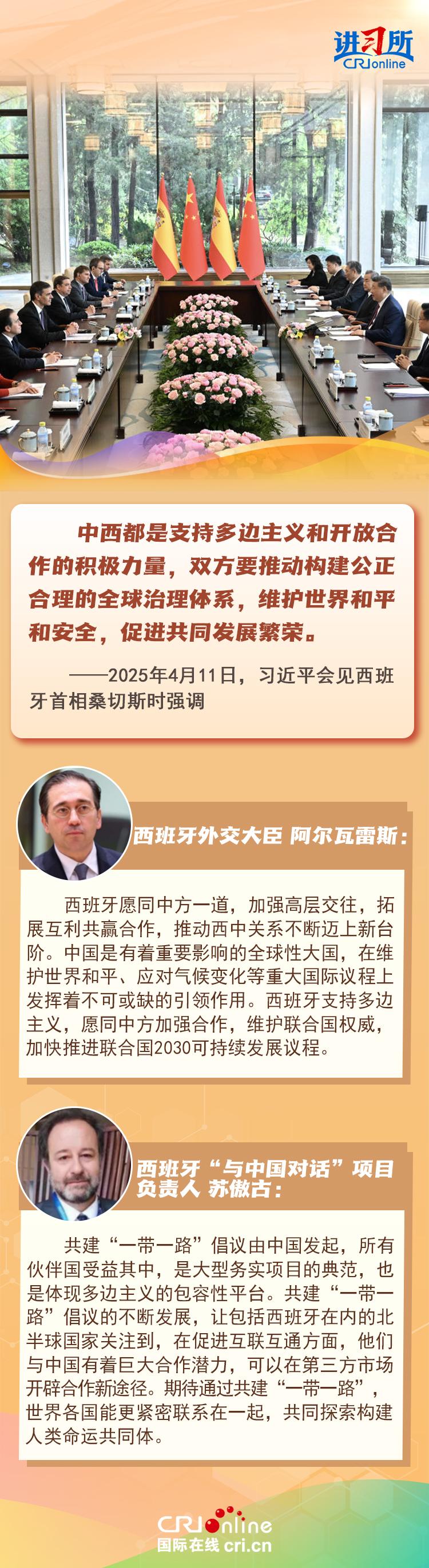 4月11日,中国国家主席习近平在北京会见来华访问的西班牙首相桑切斯时表示,中西友好是两国人民基于传统友谊、现实需要、长远利益作出的正确抉择,中西都是支持多边主义和开放合作的积极力量,双方要推动构建公正合理的全球治理体系,维护世界和平和安全,促进共同发展繁荣。